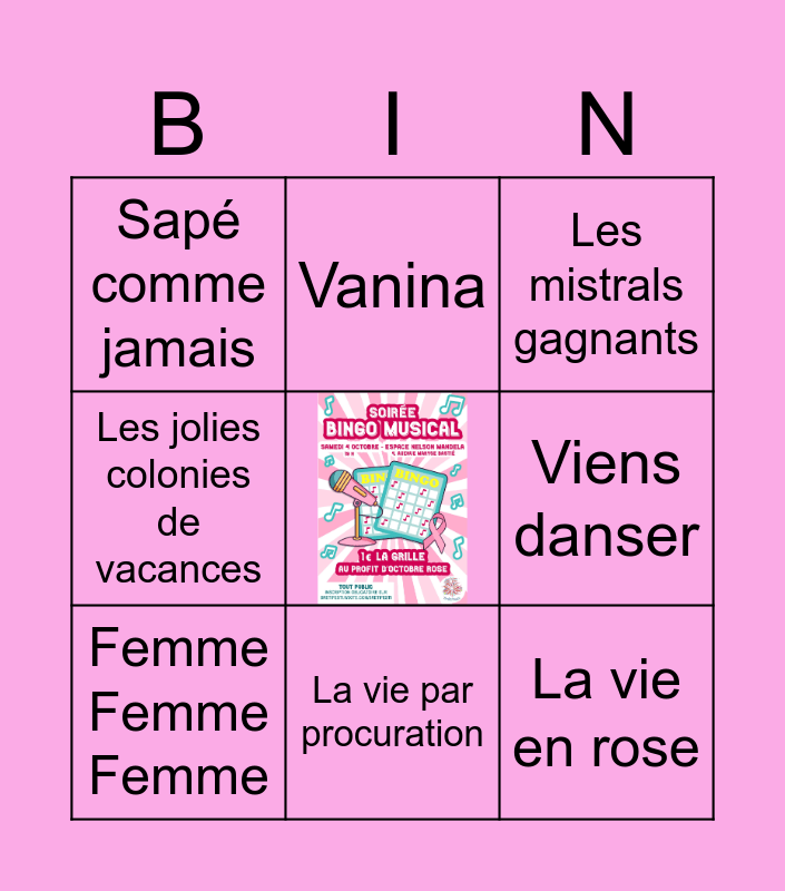 This bingo card has a free space and 10 words: La vie par procuration, Les mistrals gagnants, Sapé comme jamais, La vie en rose, Les jolies colonies de vacances, Femme Femme Femme, Vanina, Alexandrie Alexandra, Viens danser and We are the champions.