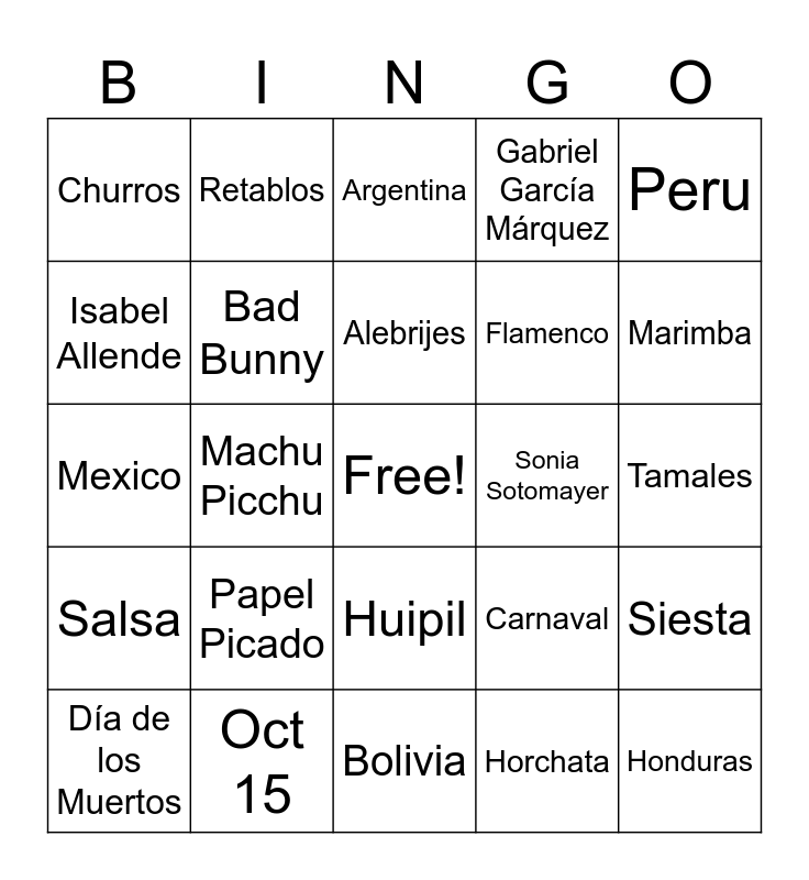 This bingo card has a free space and 24 words: Papel Picado, Oct 15, Alebrijes, Día de los Muertos, Peru, Churros, Isabel Allende, Retablos, Sonia Sotomayer, Huipil, Flamenco, Mexico, Carnaval, Siesta, Bad Bunny, Horchata, Tamales, Argentina, Marimba, Machu Picchu, Honduras, Salsa, Gabriel García Márquez and Bolivia.