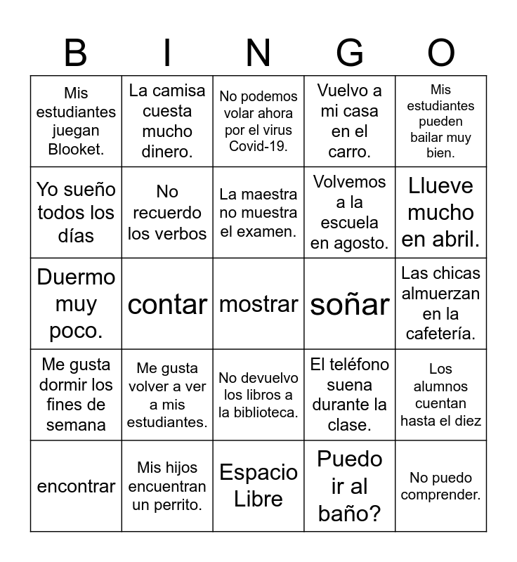 This bingo card has 25 words: Me gusta dormir los fines de semana, Mis hijos encuentran un perrito., mostrar, Puedo ir al baño?, Mis estudiantes pueden bailar muy bien., Mis estudiantes juegan Blooket., La camisa cuesta mucho dinero., No podemos volar ahora por el virus Covid-19., soñar, Los alumnos cuentan hasta el diez, Yo sueño todos los días, No recuerdo los verbos, Espacio Libre, El teléfono suena durante la clase., Llueve mucho en abril., encontrar, contar, La maestra no muestra el examen., Volvemos a la escuela en agosto., Las chicas almuerzan en la cafetería., Duermo muy poco., Me gusta volver a ver a mis estudiantes., No devuelvo los libros a la biblioteca., Vuelvo a mi casa en el carro. and No puedo comprender..