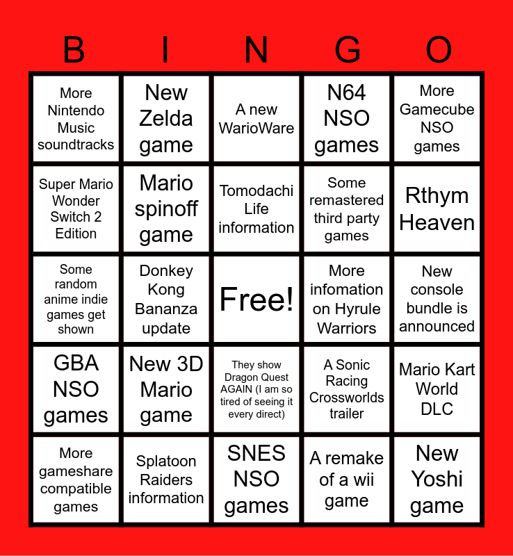 This bingo card has a free space and 24 words: New 3D Mario game, Splatoon Raiders information, Tomodachi Life information, More gameshare compatible games, More Gamecube NSO games, More Nintendo Music soundtracks, Super Mario Wonder Switch 2 Edition, New Zelda game, More infomation on Hyrule Warriors, They show Dragon Quest AGAIN (I am so tired of seeing it every direct), Some remastered third party games, Some random anime indie games get shown, A Sonic Racing Crossworlds trailer, Mario Kart World DLC, Mario spinoff game, A remake of a wii game, New console bundle is announced, A new WarioWare, Rthym Heaven, Donkey Kong Bananza update, New Yoshi game, GBA NSO games, N64 NSO games and SNES NSO games.