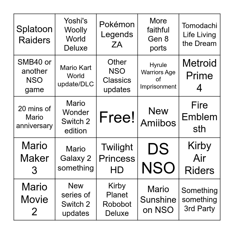 This bingo card has a free space and 24 words: Mario Galaxy 2 something, New series of Switch 2 updates, Other NSO Classics updates, Mario Movie 2, Tomodachi Life Living the Dream, Splatoon Raiders, SMB40 or another NSO game, Yoshi's Woolly World Deluxe, New Amiibos, Twilight Princess HD, Hyrule Warriors Age of Imprisonment, 20 mins of Mario anniversary, DS NSO, Kirby Air Riders, Mario Kart World update/DLC, Mario Sunshine on NSO, Fire Emblem sth, Pokémon Legends ZA, Metroid Prime 4, Mario Wonder Switch 2 edition, Something something 3rd Party, Mario Maker 3, More faithful Gen 8 ports and Kirby Planet Robobot Deluxe.