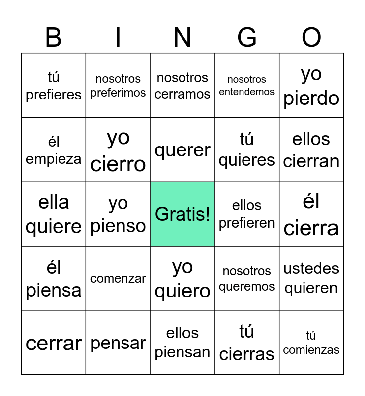 This bingo card has a free space and 24 words: comenzar, pensar, querer, cerrar, yo pierdo, tú prefieres, él empieza, nosotros preferimos, ellos prefieren, yo quiero, tú quieres, ella quiere, nosotros queremos, ustedes quieren, yo cierro, tú cierras, él cierra, nosotros cerramos, ellos cierran, yo pienso, tú comienzas, él piensa, nosotros entendemos and ellos piensan.