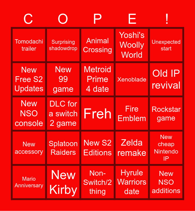 This bingo card has a free space and 24 words: Splatoon Raiders, New Kirby, Metroid Prime 4 date, Mario Anniversary, Unexpected start, Tomodachi trailer, New Free S2 Updates, Surprising shadowdrop, Fire Emblem, New S2 Editions, Xenoblade, New NSO console, Zelda remake, New cheap Nintendo IP, New 99 game, Hyrule Warriors date, Rockstar game, Animal Crossing, Old IP revival, DLC for a switch 2 game, New NSO additions, New accessory, Yoshi's Woolly World and Non-Switch/2 thing.
