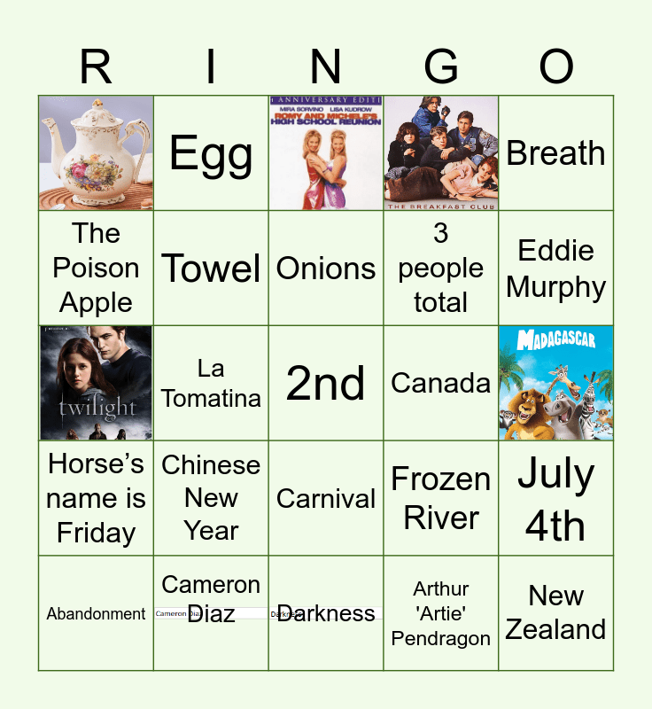 This bingo card has 11 images and 34 words: 2nd, A hole, Abandonment, "All Star", Arthur 'Artie' Pendragon, Barber, Breath, Cameron Diaz, Canada, Carnival, Chinese New Year, Darkness, Echidna, Eddie Murphy, Egg, Equador, Fairy Godmother, Festa Junina, Finland, Frozen River, Horseβs name is Friday, I'm a Believer, July 4th, Italy, La Tomatina, Letter M, Map, New Zealand, Onions, The Poison Apple, 3 people total, They're all married, Towel and Your name.