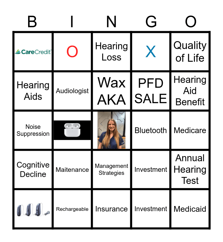 This bingo card has 5 images, a free space and 24 words: Hearing Loss, Audiologist, Maitenance, Bluetooth, Rechargeable, Medicare, Medicaid, Insurance, Investment, Hearing Aid Benefit, Stimulation, Management Strategies, Cognitive Decline, Quality of Life, Noise Suppression, Investment, Tinnitus, PFD SALE, Hearing Aids, X, O, Annual Hearing Test, Wax AKA and Cerumen.