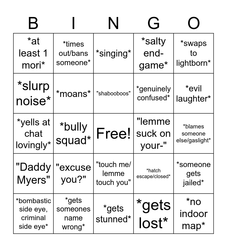 This bingo card has a free space and 24 words: "excuse you?", *gets someones name wrong*, "shabooboos", *bombastic side eye, criminal side eye*, *swaps to lightborn*, *at least 1 mori*, *slurp noise*, *times out/bans someone*, "lemme suck on your-", "touch me/ lemme touch you", *genuinely confused*, *yells at chat lovingly*, *hatch escape/closed*, *someone gets jailed*, *moans*, *gets lost*, *blames someone else/gaslight*, *singing*, *evil laughter*, *bully squad*, *no indoor map*, "Daddy Myers", *salty end-game* and *gets stunned*.