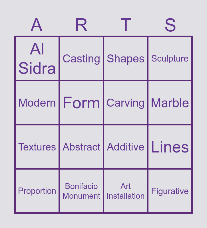 This bingo card has 16 words: Bonifacio Monument, Lines, Shapes, Al Sidra, Textures, Casting, Additive, Art Installation, Modern, Form, Proportion, Sculpture, Abstract, Marble, Carving and Figurative.