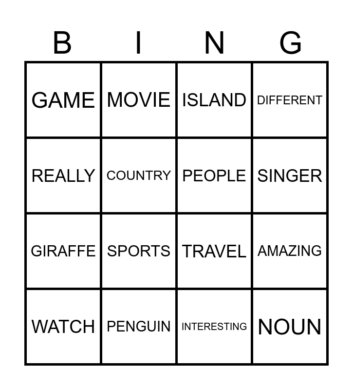 This bingo card has 16 words: PENGUIN, AMAZING, ISLAND, GAME, GIRAFFE, MOVIE, TRAVEL, INTERESTING, REALLY, COUNTRY, WATCH, DIFFERENT, SPORTS, SINGER, PEOPLE and NOUN.