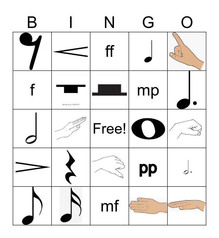 This bingo card has 21 images, a free space and 6 words: pp, p, mp, mf, f and ff.