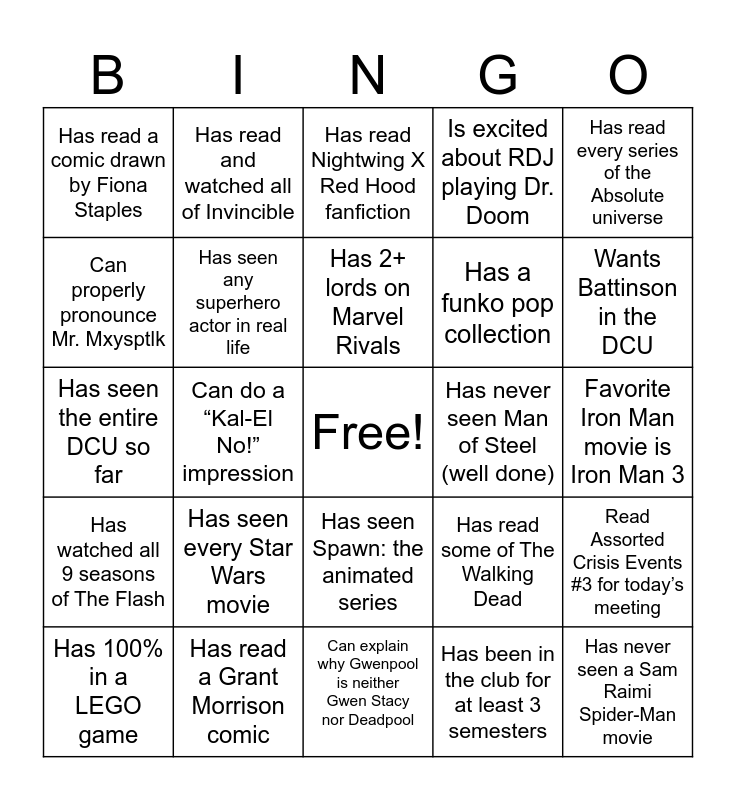 This bingo card has a free space and 24 words: Has seen every Star Wars movie, Has read a Grant Morrison comic, Has 2+ lords on Marvel Rivals, Has 100% in a LEGO game, Has read every series of the Absolute universe, Has read a comic drawn by Fiona Staples, Can properly pronounce Mr. Mxysptlk, Has read and watched all of Invincible, Has never seen Man of Steel (well done), Has seen Spawn: the animated series, Has a funko pop collection, Has seen the entire DCU so far, Has read some of The Walking Dead, Read Assorted Crisis Events #3 for today’s meeting, Has seen any superhero actor in real life, Has been in the club for at least 3 semesters, Favorite Iron Man movie is Iron Man 3, Has read Nightwing X Red Hood fanfiction, Wants Battinson in the DCU, Can do a “Kal-El No!” impression, Has never seen a Sam Raimi Spider-Man movie, Has watched all 9 seasons of The Flash, Is excited about RDJ playing Dr. Doom and Can explain why Gwenpool is neither Gwen Stacy nor Deadpool.