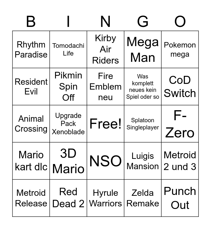 This bingo card has a free space and 24 words: Metroid Release, 3D Mario, Fire Emblem neu, Zelda Remake, Pokemon mega, Rhythm Paradise, Tomodachi Life, Kirby Air Riders, Splatoon Singleplayer, F-Zero, Animal Crossing, Pikmin Spin Off, Luigis Mansion, Metroid 2 und 3, Resident Evil, Red Dead 2, Hyrule Warriors, Mega Man, CoD Switch, Mario kart dlc, Upgrade Pack Xenoblade, NSO, Was komplett neues kein Spiel oder so and Punch Out.