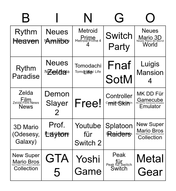 This bingo card has 14 images, a free space and 24 words: New Super Mario Bros Collection, Prof. Layton, Tomodachi Life, Peak für Switch, Neues Mario 3D World, Rythm Heaven, Neues Amiibo, Metroid Prime 4, Controller mit Skin, MK DD Für Gamecube Emulator, Zelda Film News, Neues Zelda, Splatoon Raiders, New Super Mario Bros Collection, Rythm Paradise, GTA 5, Yoshi Game, Switch Party, Luigis Mansion 4, 3D Mario (Odesesy, Galaxy), Demon Slayer 2, Youtube für Switch 2, Fnaf SotM and Metal Gear.