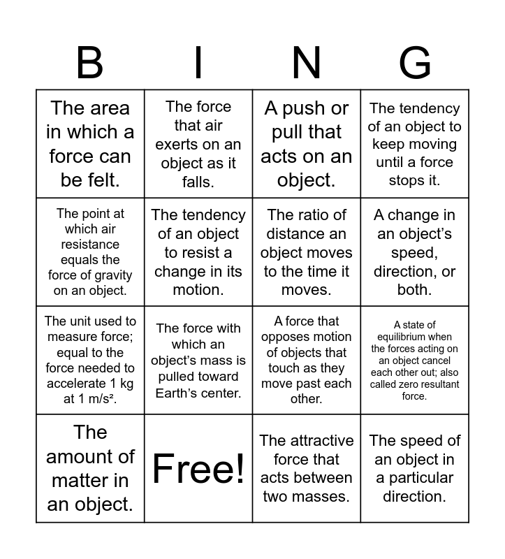 This bingo card has 16 words: Free!, A state of equilibrium when the forces acting on an object cancel each other out; also called zero resultant force., A push or pull that acts on an object., The area in which a force can be felt., The unit used to measure force; equal to the force needed to accelerate 1 kg at 1 m/s²., The force that air exerts on an object as it falls., A force that opposes motion of objects that touch as they move past each other., The attractive force that acts between two masses., The point at which air resistance equals the force of gravity on an object., The tendency of an object to resist a change in its motion., The amount of matter in an object., The tendency of an object to keep moving until a force stops it., The force with which an object’s mass is pulled toward Earth’s center., A change in an object’s speed, direction, or both., The ratio of distance an object moves to the time it moves. and The speed of an object in a particular direction..