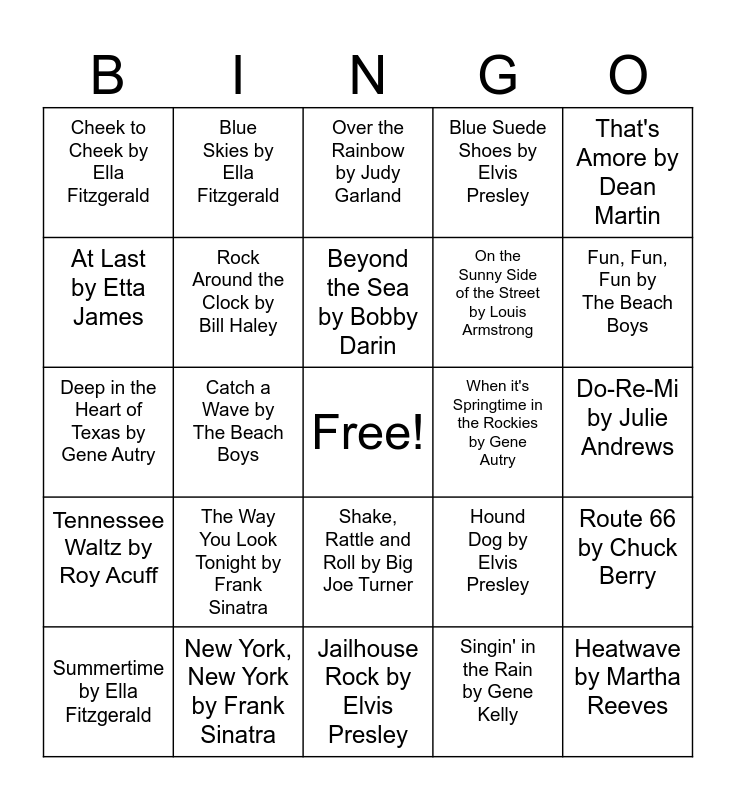 This bingo card has a free space and 24 words: The Way You Look Tonight by Frank Sinatra, New York, New York by Frank Sinatra, Beyond the Sea by Bobby Darin, Summertime by Ella Fitzgerald, That's Amore by Dean Martin, Cheek to Cheek by Ella Fitzgerald, At Last by Etta James, Blue Skies by Ella Fitzgerald, When it's Springtime in the Rockies by Gene Autry, Shake, Rattle and Roll by Big Joe Turner, On the Sunny Side of the Street by Louis Armstrong, Deep in the Heart of Texas by Gene Autry, Hound Dog by Elvis Presley, Route 66 by Chuck Berry, Rock Around the Clock by Bill Haley, Singin' in the Rain by Gene Kelly, Do-Re-Mi by Julie Andrews, Over the Rainbow by Judy Garland, Fun, Fun, Fun by The Beach Boys, Catch a Wave by The Beach Boys, Heatwave by Martha Reeves, Tennessee Waltz by Roy Acuff, Blue Suede Shoes by Elvis Presley and Jailhouse Rock by Elvis Presley.