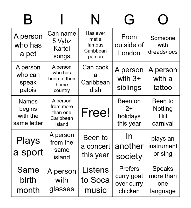 This bingo card has a free space and 24 words: A person from the same island, A person with glasses, Can cook a Caribbean dish, Same birth month, Someone with dreads/locs, A person who has a pet, A person who can speak patois, Can name 5 Vybz Kartel songs, Been on 2+ holidays this year, Been to a concert this year, A person with 3+ siblings, Names begins with the same letter, In another society, plays an instrument or sing, A person who has been to their home country, Prefers curry goat over curry chicken, Been to Notting Hill carnival, Has ever met a famous Caribbean person, A person with a tattoo, A person from more than one Caribbean island, Speaks more than one language, Plays a sport, From outside of London and Listens to Soca music.