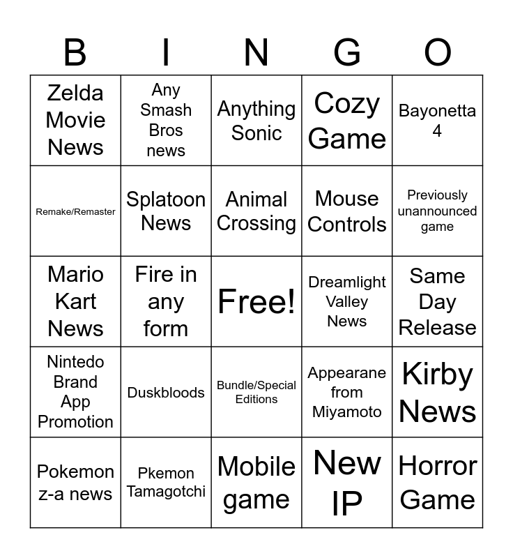 This bingo card has a free space and 24 words: Duskbloods, Pkemon Tamagotchi, Animal Crossing, Pokemon z-a news, Bayonetta 4, Zelda Movie News, Remake/Remaster, Any Smash Bros news, Dreamlight Valley News, Bundle/Special Editions, Mouse Controls, Mario Kart News, Appearane from Miyamoto, Kirby News, Splatoon News, New IP, Same Day Release, Anything Sonic, Previously unannounced game, Fire in any form, Horror Game, Nintedo Brand App Promotion, Cozy Game and Mobile game.