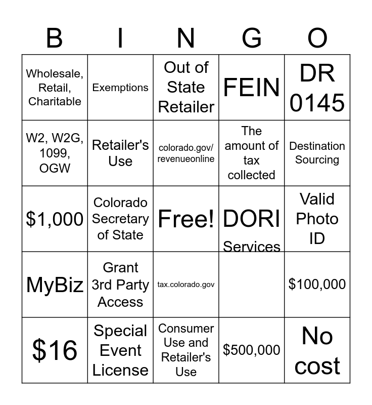 This bingo card has 40 words: Last Day of the month following the end of the quarter, $1,000, 10%, Retailer's Use, Special Event License, tax.colorado.gov, colorado.gov/ revenueonline, Sales Tax, Withholding, Unemployment, DR 0145, MyBiz, Colorado Secretary of State, FEIN, Free!, Valid Photo ID, DORI, Grant 3rd Party Access, Physical Site, Wholesale, Retail, Charitable, Non-Physical Location, Out of State Retailer, $100,000, $500,000, The amount of tax collected, W2, W2G, 1099, OGW, OGW & W2G, The amount of tax being withheld, $50 deposit, Dec 31st of every odd year, No cost, 5%, $62, $16, When there's a transfer of title or possession, Services, Destination Sourcing, Consumer Use and Retailer's Use, Special Event, Deductions, Exemptions and Taxes collected for Home Rule Cities.