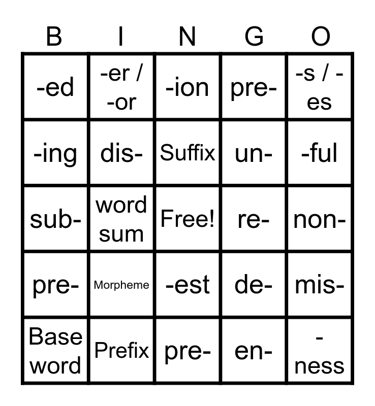 This bingo card has a free space and 24 words: Morpheme, Prefix, Suffix, Base word, -s / -es, -ed, -ing, -er / -or, re-, -est, un-, sub-, de-, mis-, dis-, en-, non-, -ion, -ful, word sum, -ness, pre-, pre- and pre-.