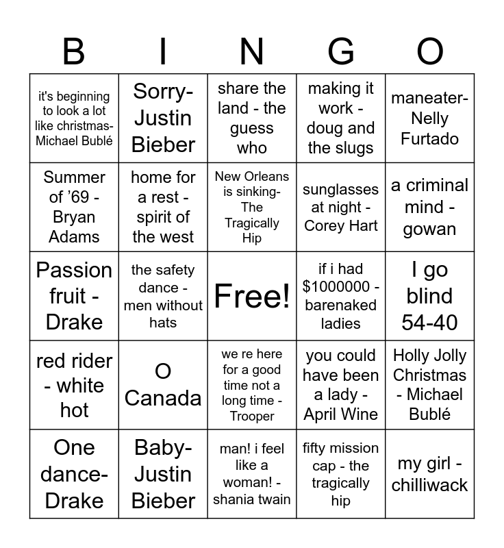This bingo card has a free space and 24 words: O Canada, Baby-Justin Bieber, New Orleans is sinking-The Tragically Hip, One dance-Drake, maneater- Nelly Furtado, it's beginning to look a lot like christmas-Michael Bublé, Summer of ’69 -Bryan Adams, Sorry-Justin Bieber, if i had $1000000 - barenaked ladies, we re here for a good time not a long time - Trooper, sunglasses at night - Corey Hart, Passion fruit - Drake, you could have been a lady - April Wine, Holly Jolly Christmas - Michael Bublé, home for a rest - spirit of the west, fifty mission cap - the tragically hip, I go blind 54-40, share the land - the guess who, a criminal mind - gowan, the safety dance - men without hats, my girl - chilliwack, red rider - white hot, making it work - doug and the slugs and man! i feel like a woman! -shania twain.