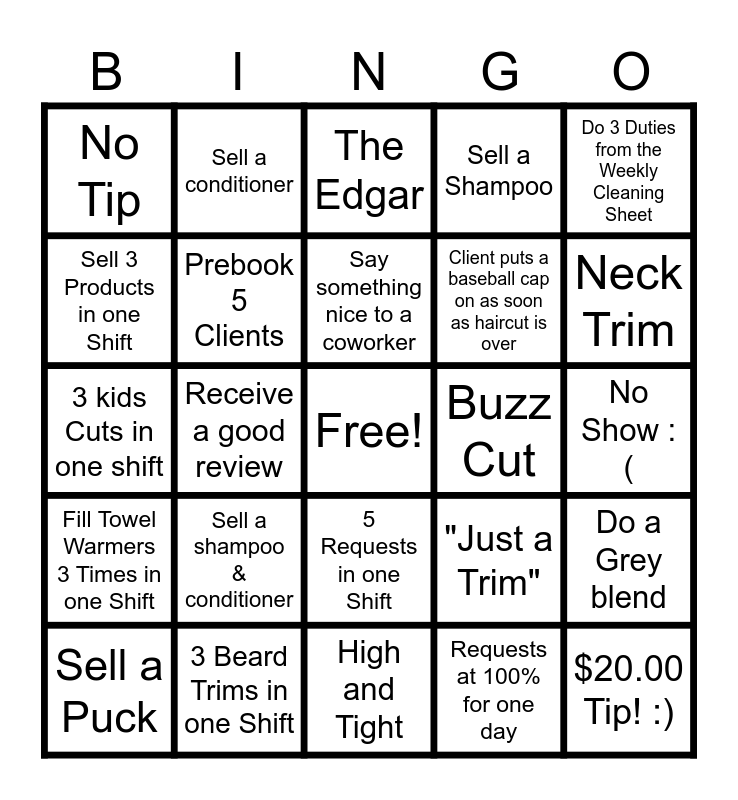 This bingo card has a free space and 29 words: Sell a Puck, Low Taper, Receive a good review, Deep Clean Station, No Tip, The Edgar, Prebook 5 Clients, Sell a shampoo & conditioner, Buzz Cut, 3 Beard Trims in one Shift, No Show :(, $20.00 Tip! :), High and Tight, Requests at 100% for one day, Neck Trim, Switch laundry 3 Times in one Shift, 5 Requests in one Shift, Fill Towel Warmers 3 Times in one Shift, Do 3 Duties from the Weekly Cleaning Sheet, 3 kids Cuts in one shift, "Just a Trim", Sweep Someone's Station, Client puts a baseball cap on as soon as haircut is over, Sell 3 Products in one Shift, Sell a Shampoo, Sell a conditioner, Do a Grey blend, Say something nice to a coworker and Add on services after appointment is started.