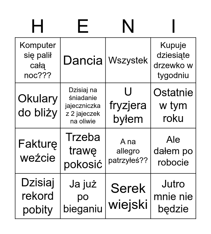 This bingo card has 16 words: Ja już po bieganiu, Ale dałem po robocie, Wszystek, Komputer się palił całą noc???, Fakturę weźcie, Dancia, A na allegro patrzyłeś??, Serek wiejski, Okulary do bliży, Dzisiaj na śniadanie jajeczniczka z 2 jajeczek na oliwie, Dzisiaj rekord pobity, Kupuje dziesiąte drzewko w tygodniu, Trzeba trawę pokosić, Ostatnie w tym roku, U fryzjera byłem and Jutro mnie nie będzie.