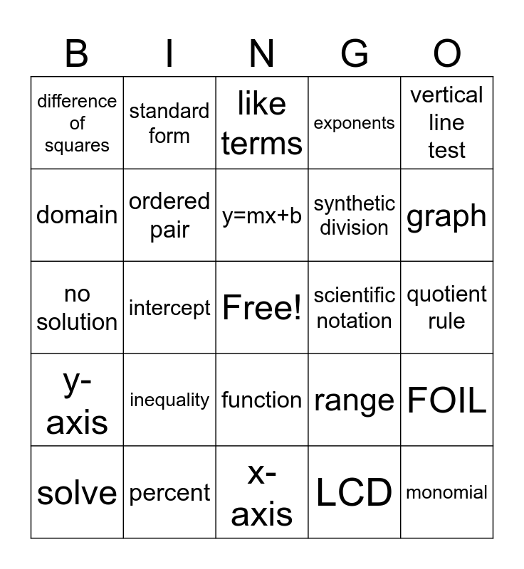 This bingo card has a free space and 24 words: inequality, percent, y=mx+b, solve, vertical line test, difference of squares, domain, standard form, scientific notation, function, synthetic division, no solution, range, FOIL, ordered pair, LCD, quotient rule, like terms, graph, intercept, monomial, y-axis, exponents and x-axis.