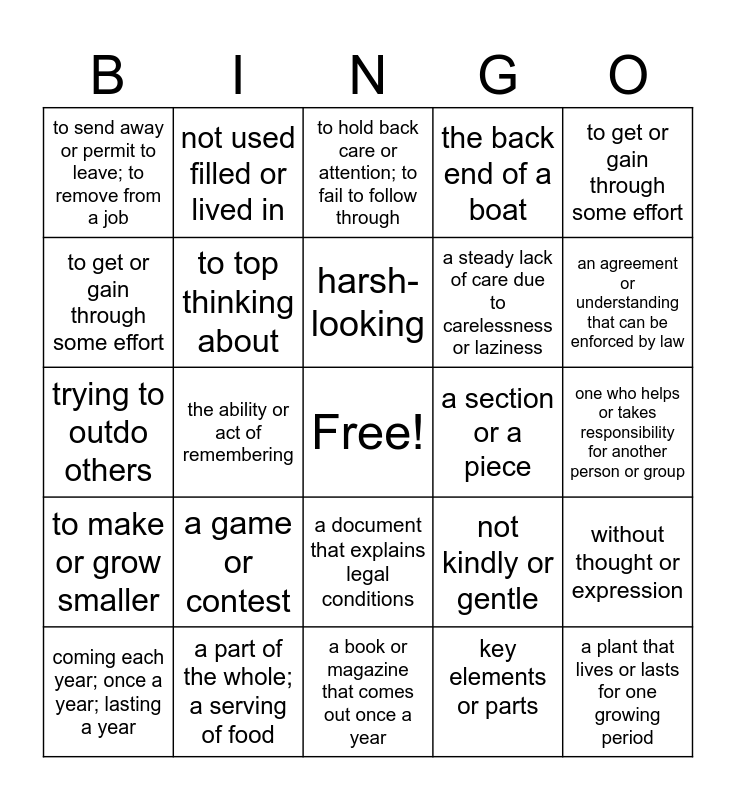 This bingo card has a free space and 29 words: coming each year; once a year; lasting a year, having to do with the main or starting point of something, the ability or act of remembering, to come down with as a sickness, to send away or permit to leave; to remove from a job, to hold back care or attention; to fail to follow through, to top thinking about, a game or contest, a section or a piece, a part of the whole; a serving of food, one who helps or takes responsibility for another person or group, a plant that lives or lasts for one growing period, a book or magazine that comes out once a year, key elements or parts, an agreement or understanding that can be enforced by law, to act as a sponsor to a group, person or event, a document that explains legal conditions, to make or grow smaller, to get or gain through some effort, trying to outdo others, not kindly or gentle, to bring back to mind, a steady lack of care due to carelessness or laziness, to get or gain through some effort, the back end of a boat, not used filled or lived in, without thought or expression, harsh-looking and to ask to return.