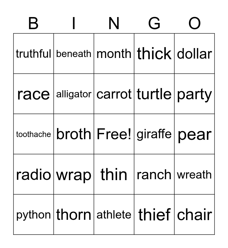 This bingo card has a free space and 24 words: wrap, thorn, carrot, python, dollar, truthful, race, beneath, giraffe, thin, turtle, toothache, ranch, wreath, alligator, thief, pear, month, party, broth, chair, radio, thick and athlete.