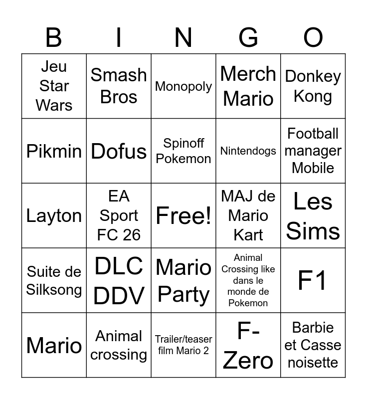 This bingo card has a free space and 24 words: DLC DDV, Animal crossing, Spinoff Pokemon, Mario, Donkey Kong, Jeu Star Wars, Pikmin, Smash Bros, MAJ de Mario Kart, Mario Party, Nintendogs, Layton, Animal Crossing like dans le monde de Pokemon, F1, Dofus, F-Zero, Les Sims, Monopoly, Football manager Mobile, EA Sport FC 26, Barbie et Casse noisette, Suite de Silksong, Merch Mario and Trailer/teaser film Mario 2.