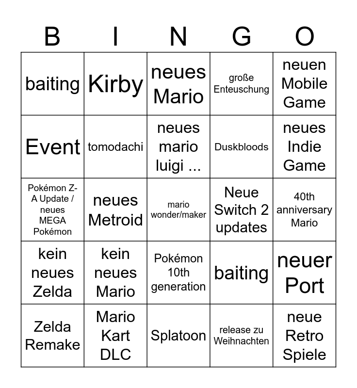 This bingo card has a free space and 24 words: kein neues Mario, Mario Kart DLC, neues mario luigi ..., Zelda Remake, neuen Mobile Game, baiting, Event, Kirby, Neue Switch 2 updates, Pokémon 10th generation, Duskbloods, Pokémon Z-A Update / neues MEGA Pokémon, baiting, neuer Port, tomodachi, release zu Weihnachten, 40th anniversary Mario, neues Mario, neues Indie Game, neues Metroid, neue Retro Spiele, kein neues Zelda, große Enteuschung and Splatoon.