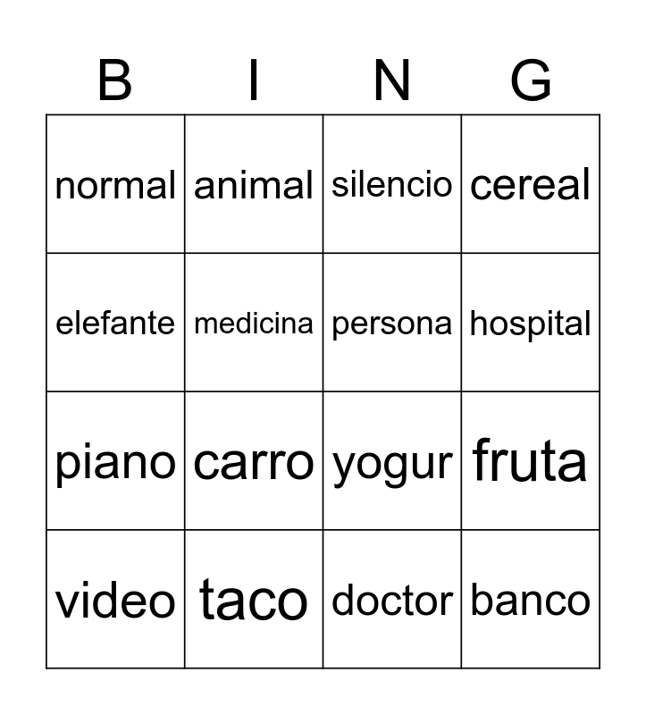 This bingo card has 16 words: taco, fruta, silencio, normal, piano, animal, yogur, doctor, elefante, medicina, video, cereal, carro, hospital, persona and banco.
