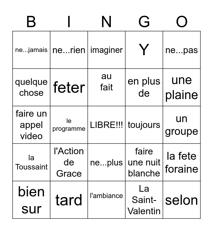 This bingo card has a free space and 25 words: l'Action de Grace, l'ambiance, au fait, bien sur, ne...pas, ne...jamais, quelque chose, ne...rien, toujours, ne...plus, en plus de, faire un appel video, faire une nuit blanche, la fete foraine, feter, un feu de joie, un groupe, imaginer, une plaine, le programme, selon, tard, la Toussaint, Y and La Saint-Valentin.