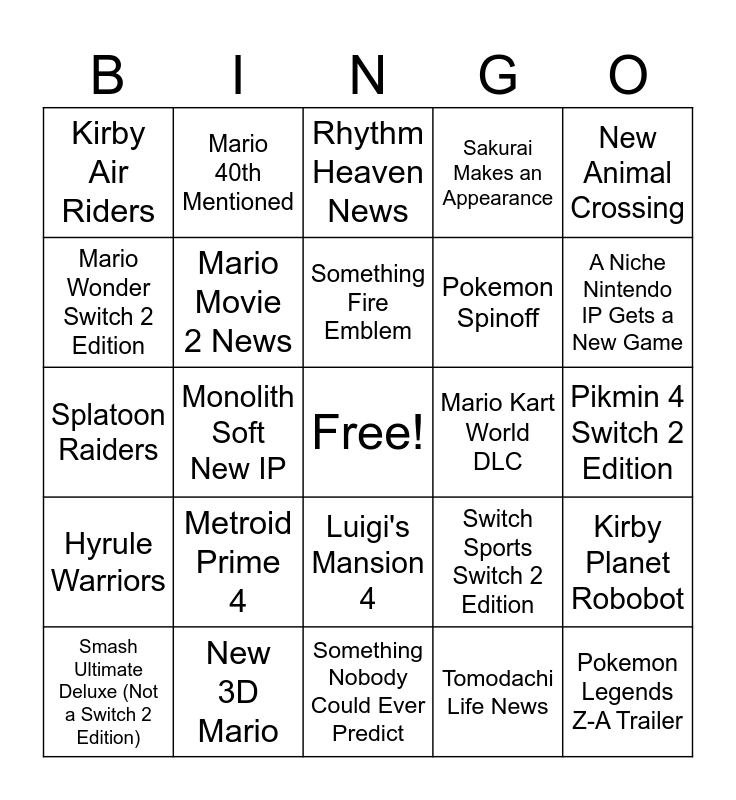 This bingo card has a free space and 24 words: Metroid Prime 4, New 3D Mario, Something Fire Emblem, Smash Ultimate Deluxe (Not a Switch 2 Edition), New Animal Crossing, Kirby Air Riders, Mario Wonder Switch 2 Edition, Mario 40th Mentioned, Mario Kart World DLC, Luigi's Mansion 4, Pokemon Spinoff, Splatoon Raiders, Switch Sports Switch 2 Edition, Kirby Planet Robobot, Mario Movie 2 News, Tomodachi Life News, Pikmin 4 Switch 2 Edition, Rhythm Heaven News, A Niche Nintendo IP Gets a New Game, Monolith Soft New IP, Pokemon Legends Z-A Trailer, Hyrule Warriors, Sakurai Makes an Appearance and Something Nobody Could Ever Predict.