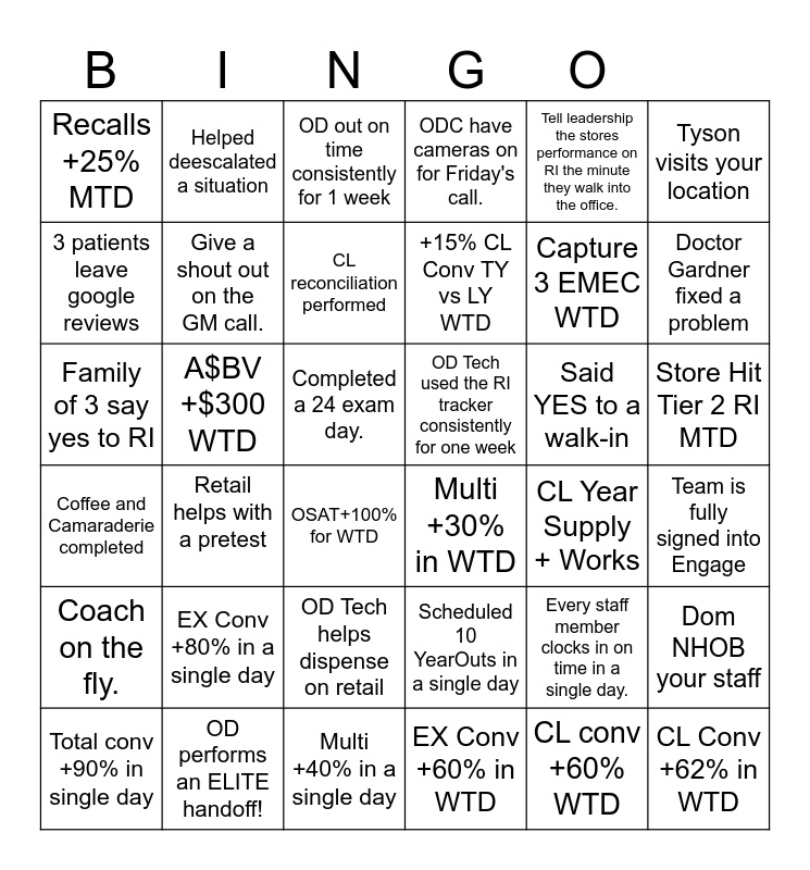 This bingo card has 47 words: Sales to Plan 100%MTD, Family of 3 say yes to RI, Coached an opportunity, CL Year Supply + Works, Said YES to a walk-in, Scheduled 10 YearOuts in a single day, Helped deescalated a situation, Hit +70% RI in single day., Tyson visits your location, OD performs an ELITE handoff!, 3 patients leave google reviews, ODC have cameras on for Friday's call., Retail helps with a pretest, Coffee and Camaraderie completed, CL conv +60% WTD, OD Tech helps dispense on retail, Give a shout out on the GM call., A$BV +$300 WTD, Free!, Tell leadership the stores performance on RI the minute they walk into the office., Doctor Gardner fixed a problem, Team is fully signed into Engage, Recalls +25% MTD, CL reconciliation performed, Doctor P Liles covers your office., +15% CL Conv TY vs LY WTD, OSAT+100% for WTD, Store Hit Tier 1 RI Bonus MTD, Store Hit Tier 2 RI MTD, OD Tech used the RI tracker consistently for one week, Checked Google Docs consistently for one week, EX Conv +80% in a single day, EX Conv +60% in WTD, CL Conv +62% in WTD, Multi +40% in a single day, Multi +30% in WTD, Completed a 24 exam day., Total conv +90% in single day, Sold 2 annual supplys of contacts in 1 day., Every staff member clocks in on time in a single day., Coach on the fly., OD out on time consistently for 1 week, Capture 3 EMEC WTD, EPH 2.1 WTD, ASD 17.5 WTD, Dom NHOB your staff and OD helps flip a patient to saying YES for RI..
