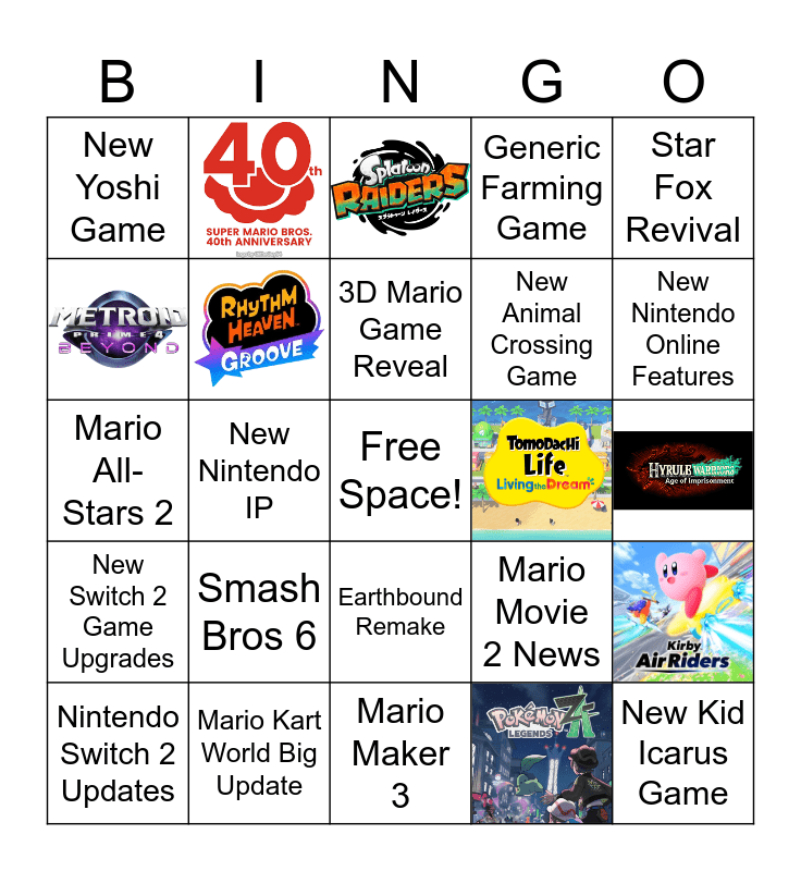 This bingo card has 8 images, a free space and 16 words: Smash Bros 6, Mario Kart World Big Update, 3D Mario Game Reveal, Nintendo Switch 2 Updates, Star Fox Revival, New Yoshi Game, Earthbound Remake, New Animal Crossing Game, Mario All-Stars 2, Mario Movie 2 News, New Nintendo Online Features, New Nintendo IP, New Kid Icarus Game, New Switch 2 Game Upgrades, Generic Farming Game and Mario Maker 3.