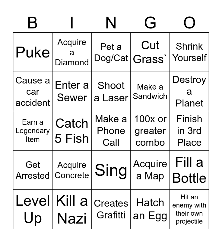 This bingo card has 30 words: Kill a Nazi, Go to Texas, Catch 5 Fish, Flex, Puke, Pet a Dog/Cat, Enter a Sewer, Sing, 100x or greater combo, Creates Grafitti, Finish in 3rd Place, Make a Phone Call, Hatch an Egg, Hit an enemy with their own projectile, Destroy a Planet, Consume Human Flesh, Acquire a Map, Get Arrested, Acquire Concrete, Shrink Yourself, Earn a Legendary Item, Wear a Crown, Acquire a Diamond, Make a Sandwich, Cause a car accident, Cut Grass`, Fill a Bottle, Level Up, Shoot a Laser and Earn a million dollars.