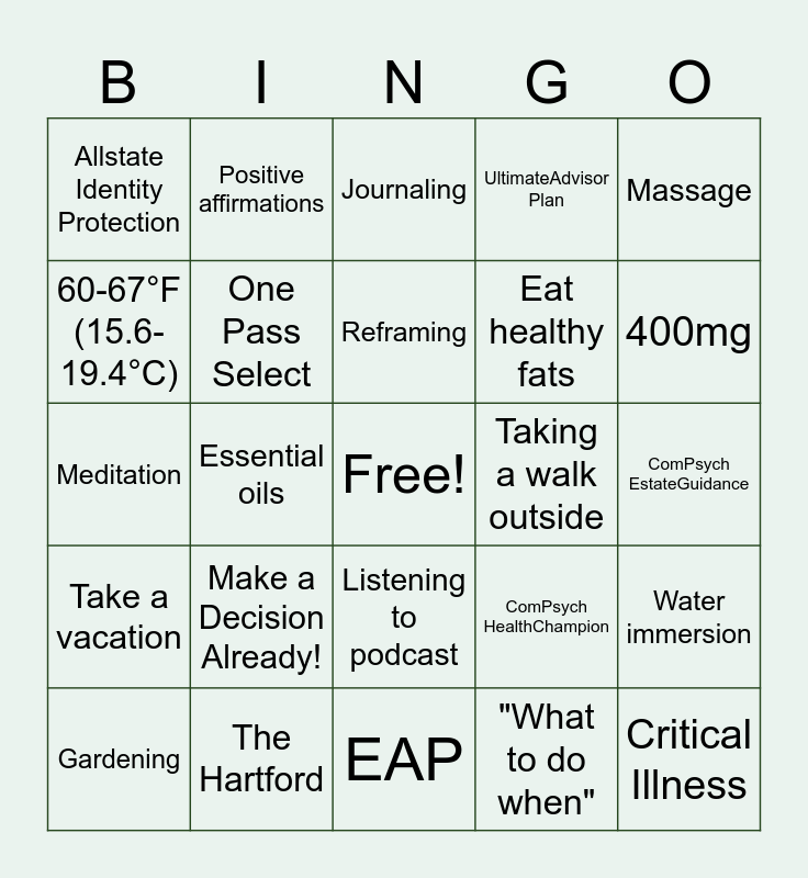This bingo card has a free space and 44 words: ComPsych Huddles, Make a Decision Already!, Movn Health, "What to do when", Calm Health, LetsGetChecked, One Pass Select, Maven Maternity, UltimateAdvisor Plan, Critical Illness, Allstate Identity Protection, The Hartford, ComPsych HealthChampion, ComPsych EstateGuidance, Reading a book, Listening to music, EAP, Taking a walk outside, Yoga, Meditation, Positive affirmations, Listening to podcast, Fitness activities, Massage, Art!, Kindness to others, Reframing, Socializing, Water immersion, Gardening, Pets!, Journaling, Daily routine/ritual, Buy yourself flowers, Take a vacation, Practice gratitude, Watch a comfort show, Weighted blanket, 400mg, 60-67°F (15.6-19.4°C), Essential oils, Eat whole grains, Eat healthy fats and Eat fiber.