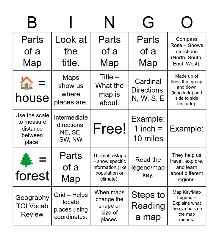 This bingo card has a free space and 38 words: What Is Geography?, Geography is the study of places and the people who live there., Why Maps Matter, Maps show us where places are., They help us travel, explore, and learn about different regions., Parts of a Map, Title – What the map is about., Parts of a Map, Compass Rose – Shows directions (North, South, East, West)., Cardinal Directions: N, W, S, E, Intermediate directions: NE, SE, SW, NW, Parts of a Map, Map Key/Map Legend – Explains what the symbols on the map means., Example:, 🏠 = house, 🌲 = forest, 🚗 = road, Parts of a Map, Scale – Shows distances on the map., Example: 1 inch = 10 miles, Parts of a Map, Grid – Helps locate places using coordinates., Made up of lines that go up and down (longitude) and side to side (latitude)., Geography TCI Vocab Review, Distortion:, When maps change the shape or size of places., Map Projection:, A way to show the round Earth on flat paper., Types of Maps, Political Maps – show countries and cities., Physical Maps – show landforms like mountains and rivers., Thematic Maps – show specific information (like population or climate)., Steps to Reading a map, Look at the title., Find the compass rose., Read the legend/map key., Use the scale to measure distance between place. and Use the grid to find the exact locations of things..