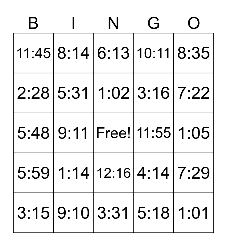 This bingo card has a free space and 43 words: 10:00, 1:01, 12:30, 3:15, 4:20, 5:18, 6:13, 7:45, 8:35, 9:10, 10:11, 11:55, 12:16, 1:14, 2:12, 3:31, 4:18, 5:48, 6:20, 7:22, 8:14, 9:24, 10:18, 11:45, 12:33, 1:05, 2:13, 3:56, 4:14, 5:59, 6:16, 7:29, 8:30, 9:11, 10:19, 11:29, 12:46, 1:02, 2:28, 3:16, 4:21, 5:31 and 6:58.