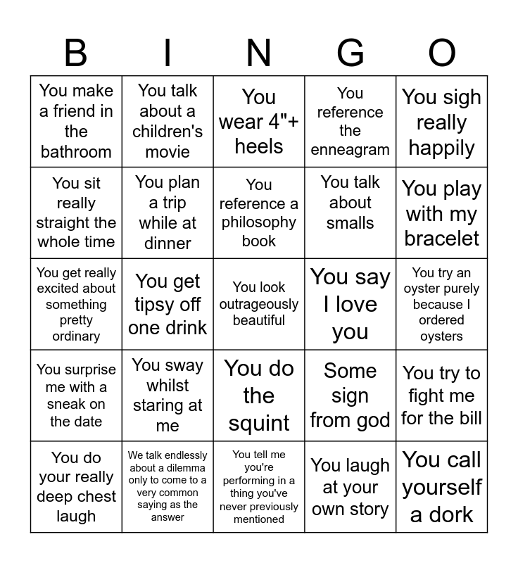 This bingo card has a free space and 24 words: You sway whilst staring at me, We talk endlessly about a dilemma only to come to a very common saying as the answer, You reference a philosophy book, You do your really deep chest laugh, You sigh really happily, You make a friend in the bathroom, You sit really straight the whole time, You talk about a children's movie, You say I love you, You do the squint, You talk about smalls, You get really excited about something pretty ordinary, Some sign from god, You try to fight me for the bill, You plan a trip while at dinner, You laugh at your own story, You try an oyster purely because I ordered oysters, You wear 4"+ heels, You play with my bracelet, You get tipsy off one drink, You call yourself a dork, You surprise me with a sneak on the date, You reference the enneagram and You tell me you're performing in a thing you've never previously mentioned.