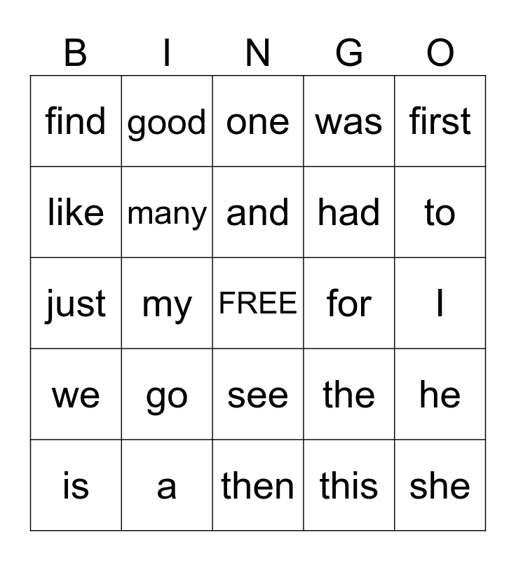 This bingo card has a free space and 24 words: go, a, and, is, first, find, like, good, for, see, had, just, the, he, many, this, I, one, to, my, she, we, was and then.
