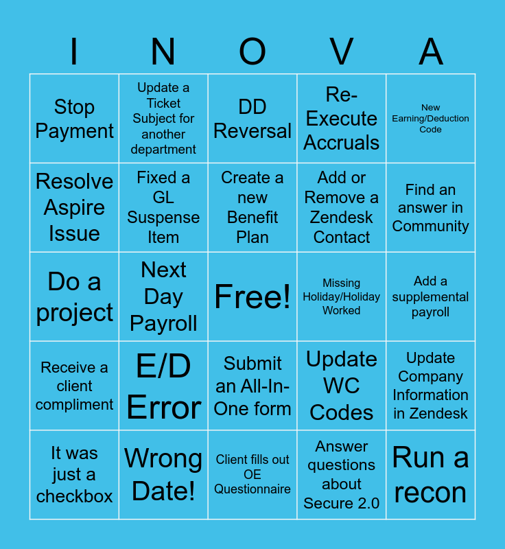 This bingo card has a free space and 29 words: It was just a checkbox, ROLLBACK!, Next Day Payroll, Service Line Call, Stop Payment, DD Reversal, Fixed a GL Suspense Item, E/D Error, Missing Holiday/Holiday Worked, Wrong Date!, Add a supplemental payroll, Run a recon, Client fills out OE Questionnaire, Answer questions about Secure 2.0, Find an answer in Community, Put in a UKG case, Submit an All-In-One form, Receive a client compliment, New Earning/Deduction Code, Do a project, Update WC Codes, Security Profile Questions, Add or Remove a Zendesk Contact, Resolve Aspire Issue, Re-Execute Accruals, Update a Ticket Subject for another department, Update Company Information in Zendesk, Create a new Benefit Plan and Fix or Update a workflow.