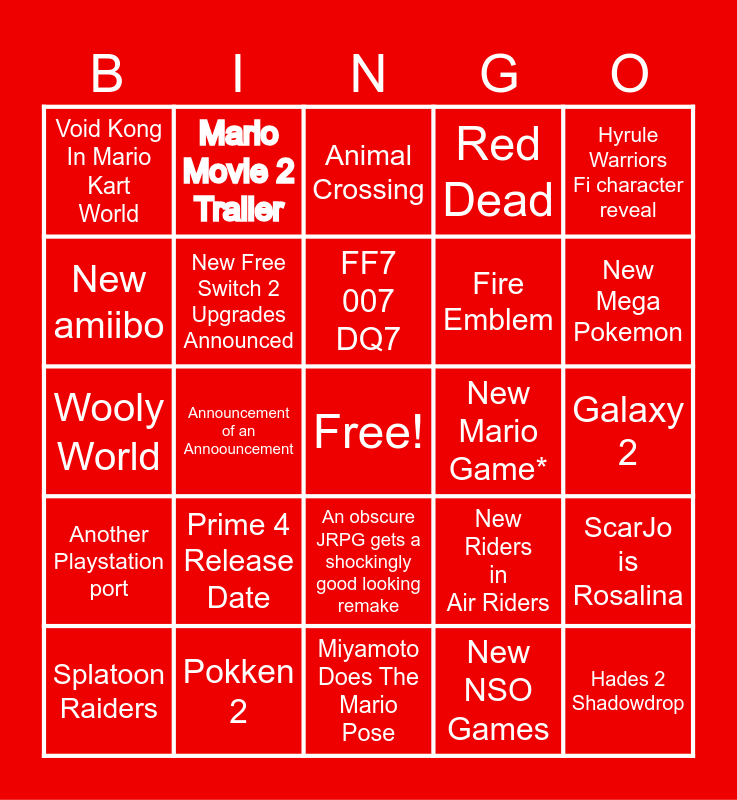 This bingo card has a free space and 24 words: Prime 4 Release Date, Pokken 2, FF7 007 DQ7, Splatoon Raiders, Hyrule Warriors Fi character reveal, Void Kong In Mario Kart World, New amiibo, Mario Movie 2 Trailer, New Mario Game*, An obscure JRPG gets a shockingly good looking remake, Fire Emblem, Wooly World, New Riders in Air Riders, ScarJo is Rosalina, New Free Switch 2 Upgrades Announced, New NSO Games, Galaxy 2, Animal Crossing, New Mega Pokemon, Announcement of an Annoouncement, Hades 2 Shadowdrop, Another Playstation port, Red Dead and Miyamoto Does The Mario Pose.
