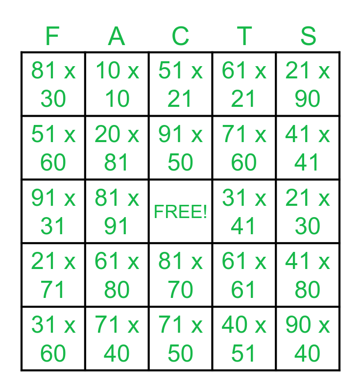 This bingo card has a free space and 24 words: 61 x 80, 71 x 40, 91 x 50, 31 x 60, 21 x 90, 81 x 30, 51 x 60, 10 x 10, 31 x 41, 81 x 70, 71 x 60, 91 x 31, 61 x 61, 41 x 80, 20 x 81, 40 x 51, 21 x 30, 51 x 21, 41 x 41, 81 x 91, 90 x 40, 21 x 71, 61 x 21 and 71 x 50.