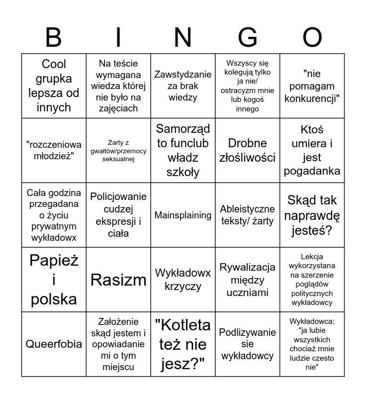 This bingo card has 25 words: Rasizm, "Kotleta też nie jesz?", Samorząd to funclub władz szkoły, Queerfobia, "nie pomagam konkurencji", Cool grupka lepsza od innych, "rozczeniowa młodzież", Na teście wymagana wiedza której nie było na zajęciach, Ableistyczne teksty/ żarty, Wykładowx krzyczy, Drobne złośliwości, Cała godzina przegadana o życiu prywatnym wykładowx, Rywalizacja między uczniami, Lekcja wykorzystana na szerzenie poglądów politycznych wykładowcy, Żarty z gwałtów/przemocy seksualnej, Wykładowca: "ja lubie wszystkich chociaż mnie ludzie czesto nie", Skąd tak naprawdę jesteś?, Zawstydzanie za brak wiedzy, Ktoś umiera i jest pogadanka, Policjowanie cudzej ekspresji i ciała, Mainsplaining, Założenie skąd jestem i opowiadanie mi o tym miejscu, Papież i polska, Wszyscy się kolegują tylko ja nie/ ostracyzm mnie lub kogoś innego and Podlizywanie sie wykładowcy.