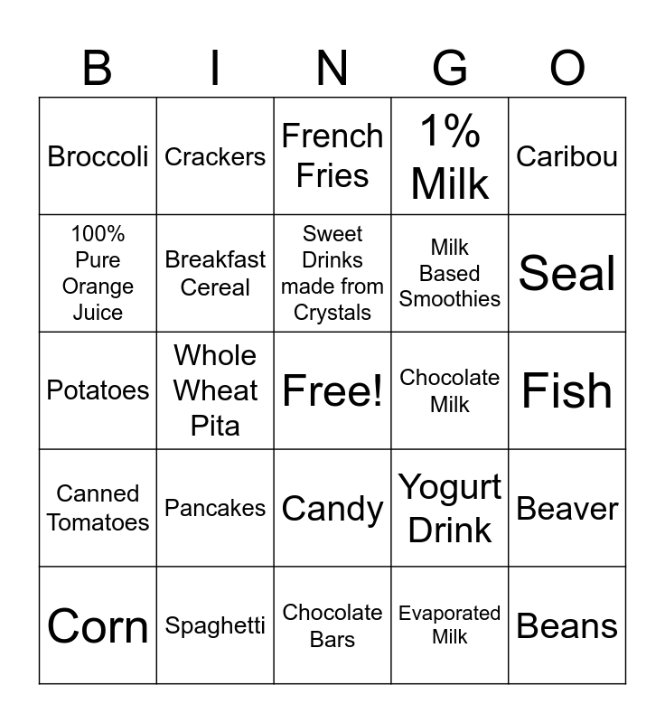 This bingo card has a free space and 75 words: Apples, Homemade Muffins, French Fries, Cheese, Eggs, Turnips, Bread, Energy Drinks, Evaporated Milk, Pork Chops, Bananas, Wild Rice, Chocolate Milk, Seal, Frozen Spinach, Breakfast Cereal, Pie, Yogurt Drink, Chicken, 100% Pure Orange Juice, Porridge/Oatmeal, Sweet Drinks made from Crystals, Milk Based Smoothies, Caribou, Broccoli, Shredded Wheat, Potato Chips, Yogurt, Peanut Butter, Frozen Berries, Whole Grain Bagel, Pop, Fortified Soy Beverage, Beaver, Potatoes, Crackers, Doughnuts, Soup made with milk, Fish, Corn, Buns, Processed Meats, Homogenized Milk, Shellfish, Raisins, Macaroni, Candy, 1% Milk, Moose, Carrots, Bannock, Chocolate Bars, Skim Milk Products, Deer, Cabbage, Rice, Cake, Cottage Cheese, Beef, Frozen Peas, Spaghetti, Ice Cream, Cheese Slices, Duck, Canned Fruit in Juice, Whole Wheat Pita, Popsicles, 2% Milk, Rabbit, Canned Tomatoes, Pancakes, Toaster Pastry, Pudding made with Milk, Beans and Cookies.
