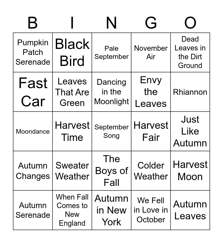 This bingo card has a free space and 42 words: September, Dancing in the Moonlight, Wake Me Up When September Ends, Sweater Weather, We Fell in Love in October, Harvest Moon, Autumn Leaves, Autumn Town Leaves, Pale September, The Boys of Fall, Just Like Autumn, Rhiannon, Harvest Time, Dead Leaves in the Dirt Ground, October Passed Me By, Colder Weather, Seasons of Wither, Moondance, Free Fallin', Black Bird, Fast Car, Wild Horses, September Girls, Pumpkin Patch Serenade, False God, Stick Season, Envy the Leaves, Willow, Where'd All the Time Go, Cough Syrup, September Morn, Autumn Changes, Leaves That Are Green, Autumn in New York, The Great Pumpkin Waltz, Autumn Serenade, When Fall Comes to New England, Harvest Fair, The September of My Years, September in the Rain, November Air and November Rain.