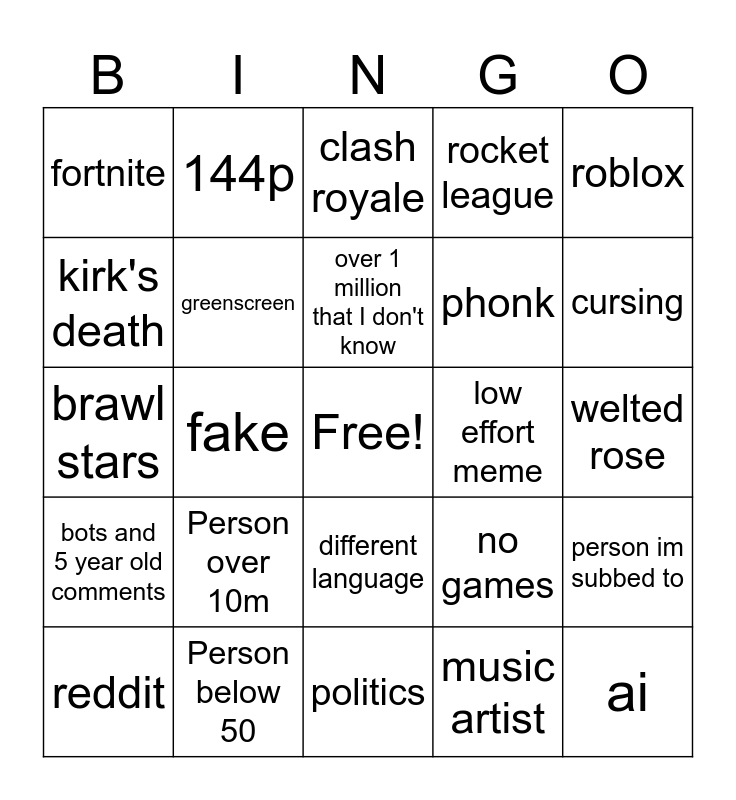 This bingo card has a free space and 24 words: Person over 10m, Person below 50, over 1 million that I don't know, reddit, roblox, fortnite, kirk's death, 144p, low effort meme, different language, phonk, brawl stars, no games, person im subbed to, greenscreen, music artist, welted rose, clash royale, cursing, fake, ai, bots and 5 year old comments, rocket league and politics.
