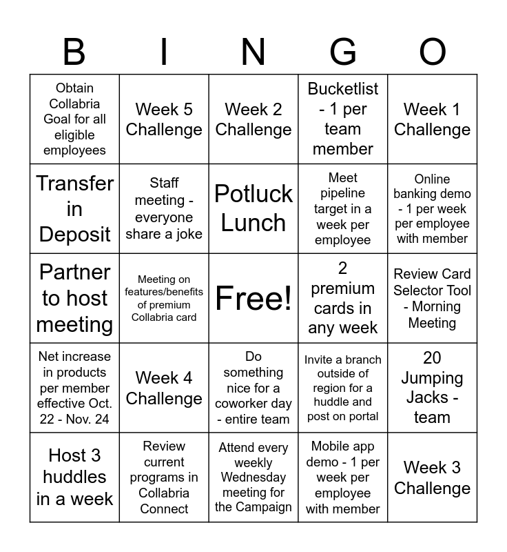 This bingo card has a free space and 24 words: Week 4 Challenge, Review current programs in Collabria Connect, Potluck Lunch, Host 3 huddles in a week, Week 1 Challenge, Obtain Collabria Goal for all eligible employees, Transfer in Deposit, Week 5 Challenge, 2 premium cards in any week, Do something nice for a coworker day - entire team, Meet pipeline target in a week per employee, Partner to host meeting, Invite a branch outside of region for a huddle and post on portal, 20 Jumping Jacks - team, Staff meeting - everyone share a joke, Mobile app demo - 1 per week per employee with member, Review Card Selector Tool - Morning Meeting, Week 2 Challenge, Online banking demo - 1 per week per employee with member, Meeting on features/benefits of premium Collabria card, Week 3 Challenge, Net increase in products per member effective Oct. 22 - Nov. 24, Bucketlist - 1 per team member and Attend every weekly Wednesday meeting for the Campaign.