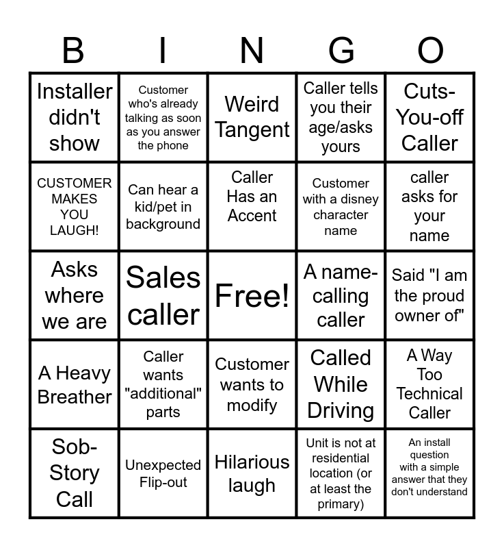 This bingo card has a free space and 36 words: Caller talks about how they are feeling, BYP Complaint, Customer Eating on The Call, Can hear a kid/pet in background, Called While Driving, A Heavy Breather, Caller Has an Accent, Doesn't know what they own, Cuts-You-off Caller, Asking to speak to a different agent from the get-go, Sales caller, Caller tells you their age/asks yours, Unprepared caller has to look for info, A name-calling caller, caller asks for your name, Installer didn't show, A Dave, Ron, Jessica or Jennifer caller, Caller wants "additional" parts, An install question with a simple answer that they don't understand, Weird Tangent, Said "I am the proud owner of", A Way Too Technical Caller, Unexpected Flip-out, Sob-Story Call, Hilarious laugh, Customer who's already talking as soon as you answer the phone, Asks where we are, Funny caller ID, Customer with a disney character name, CUSTOMER MAKES YOU LAUGH!, Spicy/Hot ASF caller, Someone else calls on behalf of the customer, Unit is not at residential location (or at least the primary), Customer wants to modify, Background noise is way too loud and Pre-sales call.